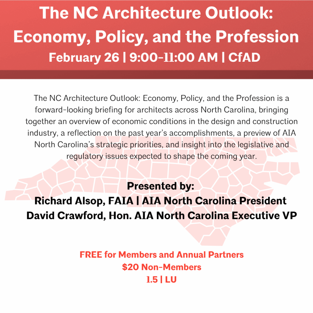 The NC Architecture Outlook: Economy, Policy, and the Profession: is a forward-looking briefing for architects across North Carolina, bringing together an overview of economic conditions in the design and construction industry, a reflection on the past year’s accomplishments, a preview of AIA North Carolina’s strategic priorities, and insight into the legislative and regulatory issues expected to shape the coming year.